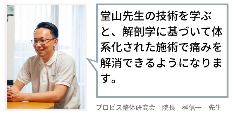 どこも受けていなくて自分で揉んだりとか、ただストレッチしたりとか、そんな感じでした。治療家としてセミナーに通ってたんですけども、どちらかというと揉んだりなどが多かったのでやった時は良かったんですけども持続しなかったんですね。
